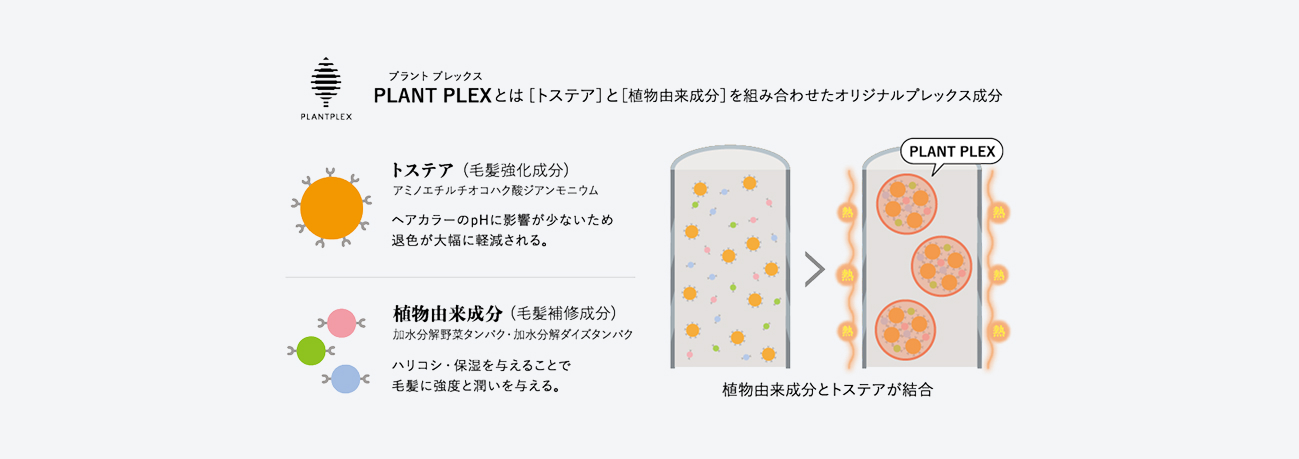 PLANT PLEXの効果で大幅な毛髪強度の向上、形状記憶の効力を高めます。質感再整メニューの施術後、合わせてホームケアを続けていただくと次回ご来店まで、髪の質感を維持することが可能です。さらに、質感再整メニュー+ホームケアを繰り返すことで、質感の向上にも繋がります。